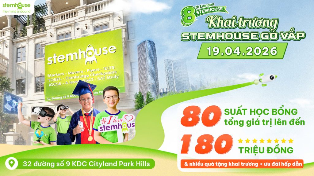 Đặc biệt: Để hỗ trợ phụ huynh Gò Vấp, Stemhouse chính thức khai trương cơ sở mới vào ngày 19/04 với 80 suất học bổng trị giá 180 triệu đồng. Đây là cơ hội tốt nhất để con Test năng lực và nhận tư vấn lộ trình vào lớp 6 miễn phí.